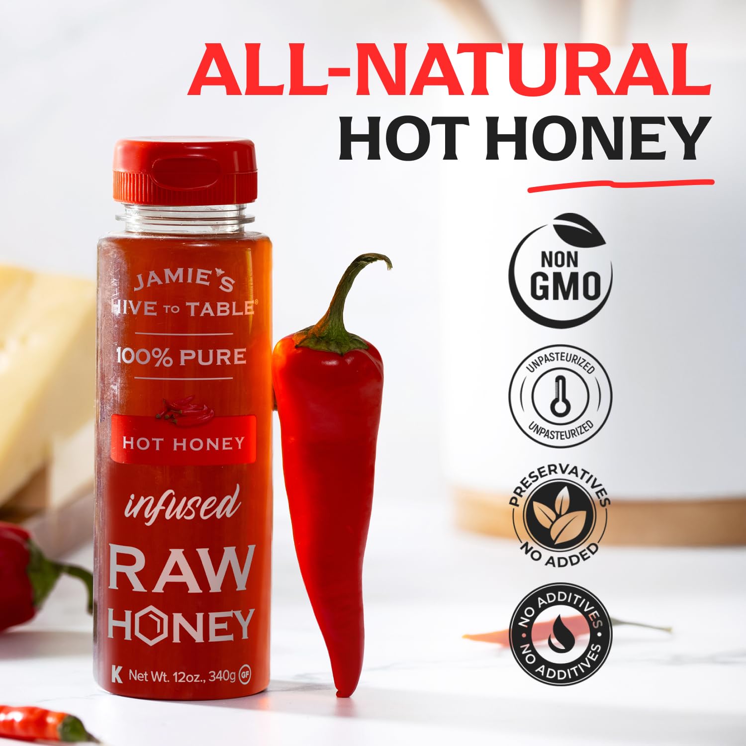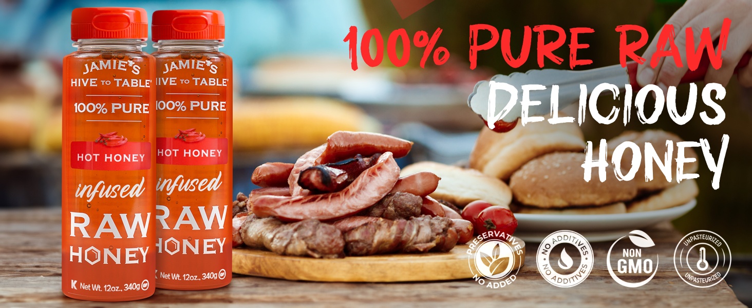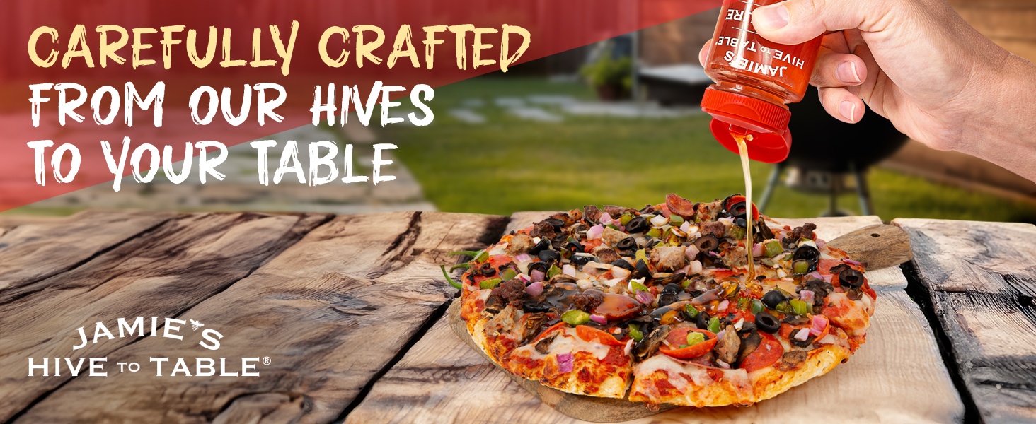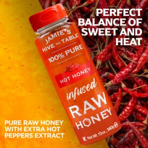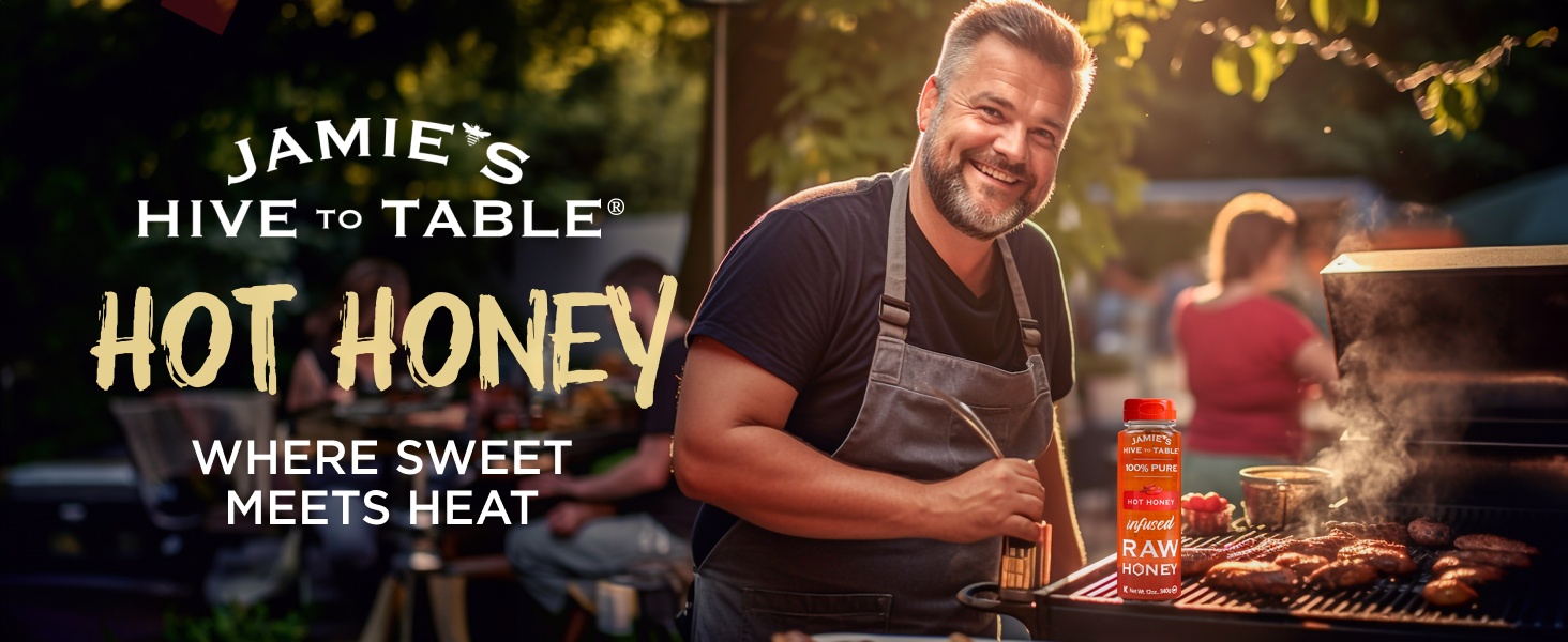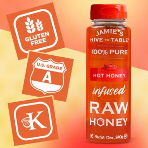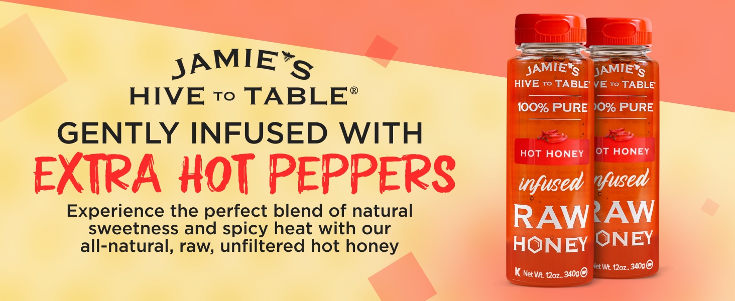 Jamie’s Hive to Table Hot Honey raw and unfiltered honey, crafted by responsible beekeepers who prioritize the health of their bees and the environment. Free from additives, preservatives, and flavorings, this non-GMO honey delivers a pure, natural sweetness straight from the hive.