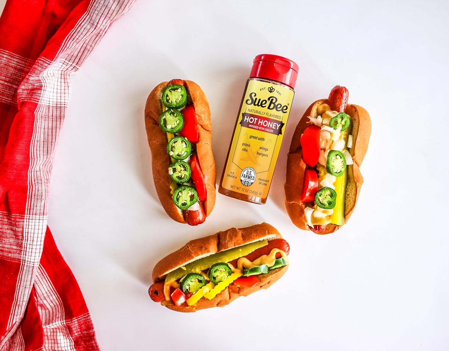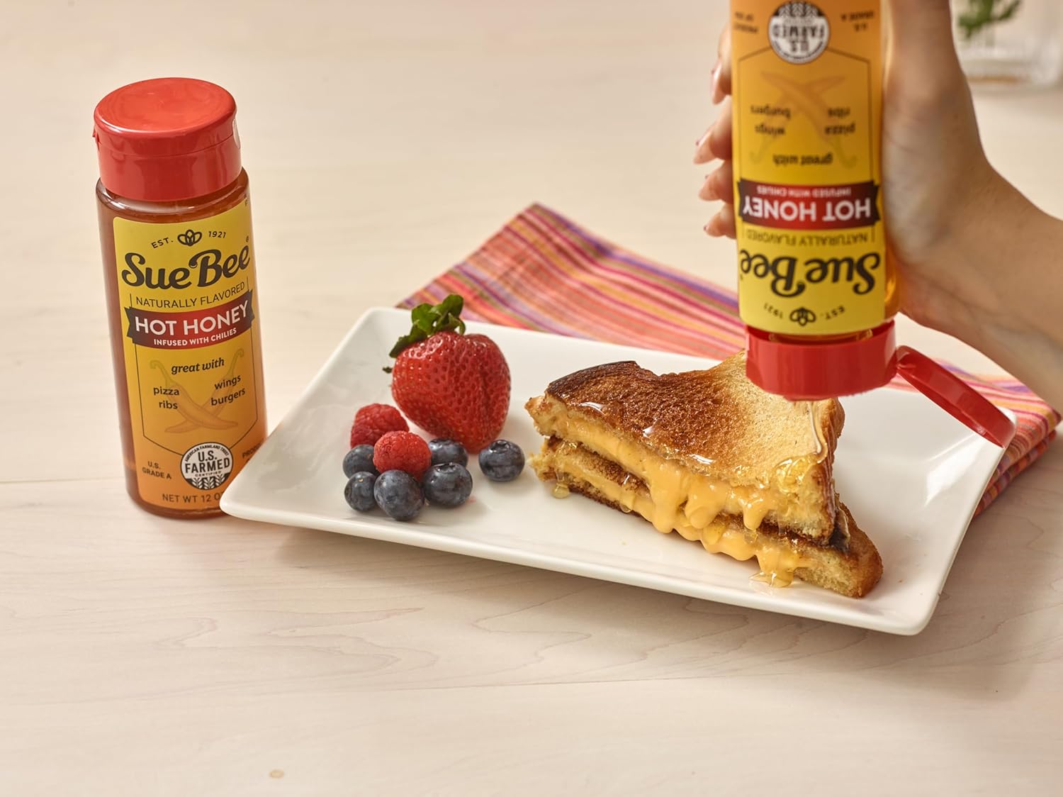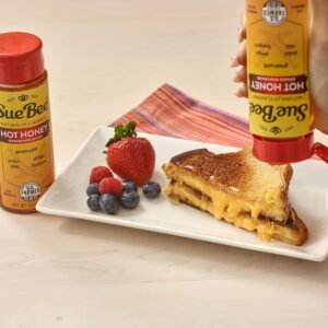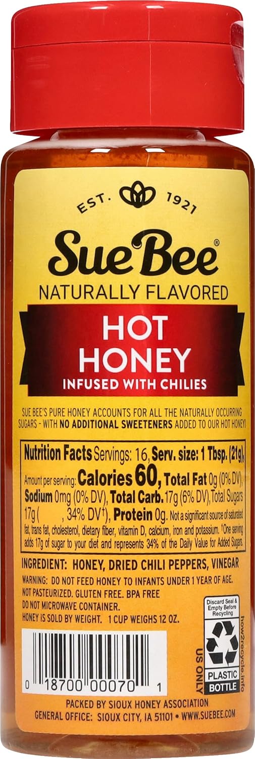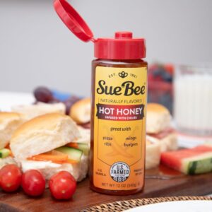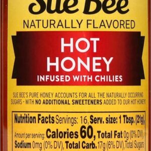 Sue Bee Naturally Infused Hot Honey is a blend of honey and chili peppers, offering a combination of natural sweetness and mild heat.